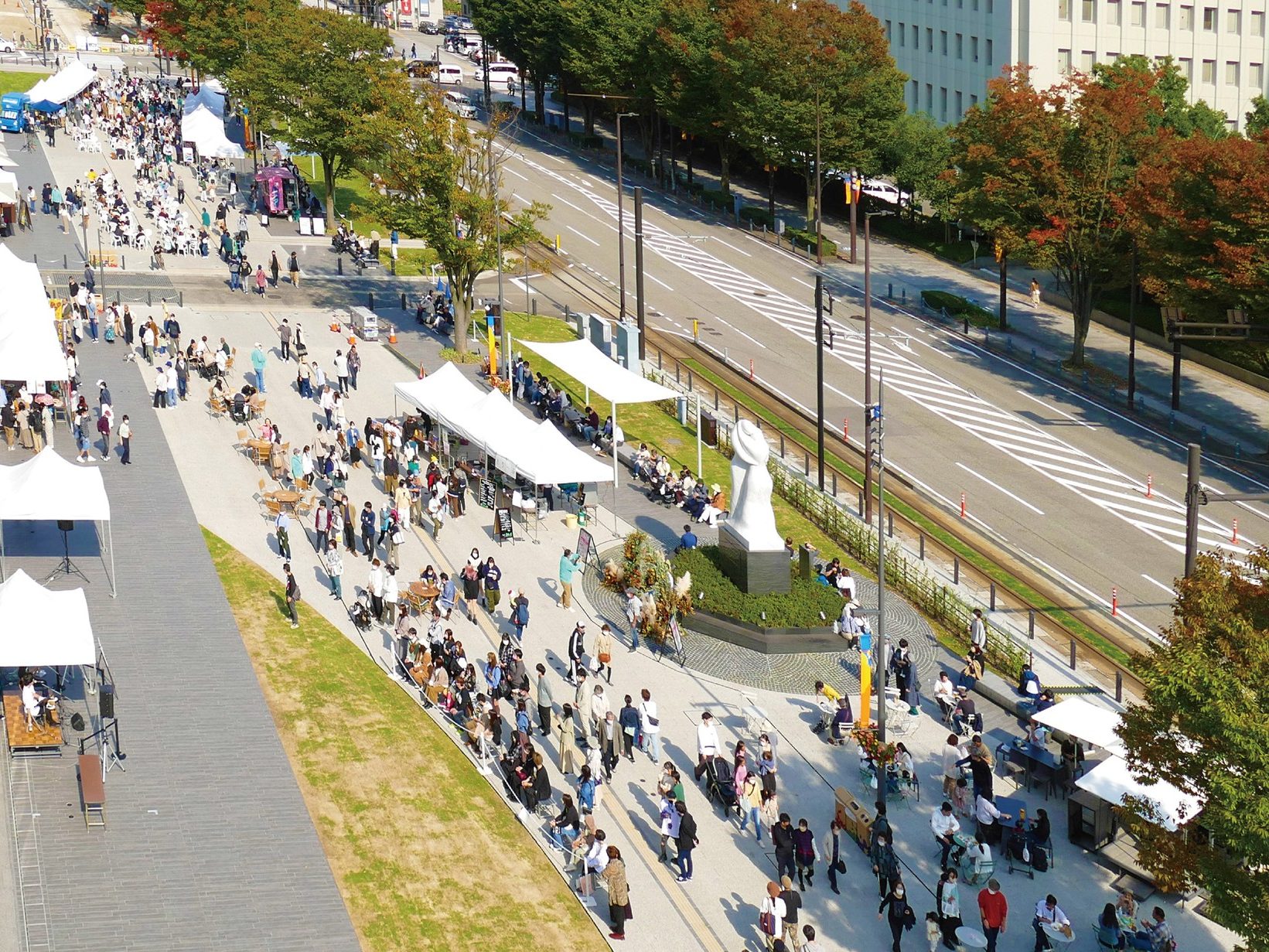ブールバール広場は、富山駅北口の全長約420m、幅員約30mの街路空間で、広場条例を活用することで通常では難しい多くの賑わいの仕掛けや、街路空間で公園のようなオープンスペースが実現しました。